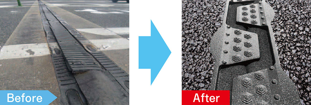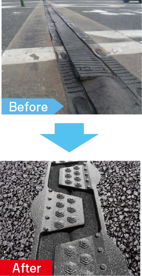 損傷した橋と橋の継ぎ目部のゴム製ジョイントを高耐久な鋼製ジョイントに更新し、走行の安全性や快適性の向上を図るとともに、周辺環境への騒音・振動を低減します。