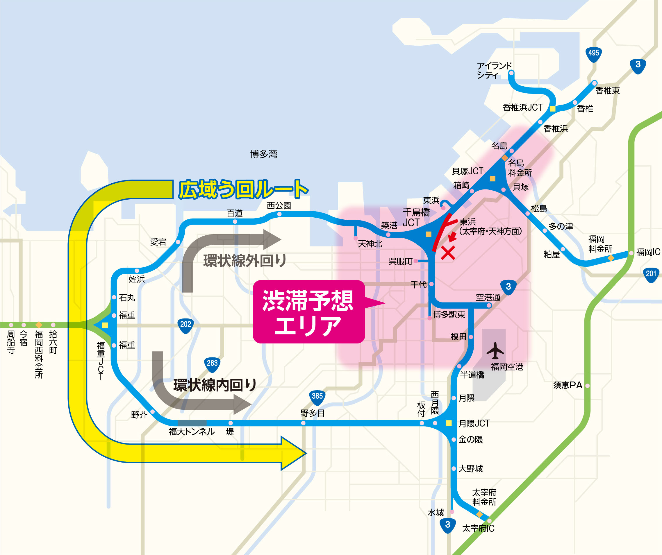 通行止め区間の通行ルートの代替として、環状線内回りを利用したう回をご検討ください。(下図を参考)