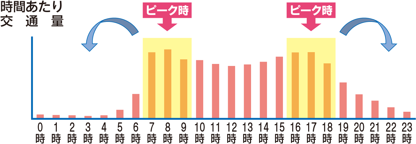 やむを得ず自動車を利用される場合は、利用時間帯を普段より早く、または遅く変更する時差利用により、渋滞が予想される日中を避けた利用をご検討ください